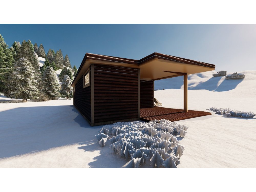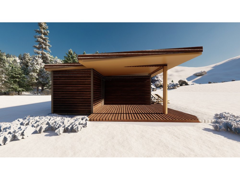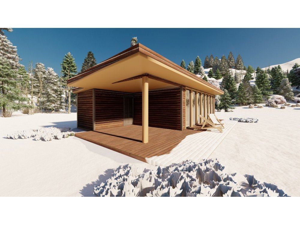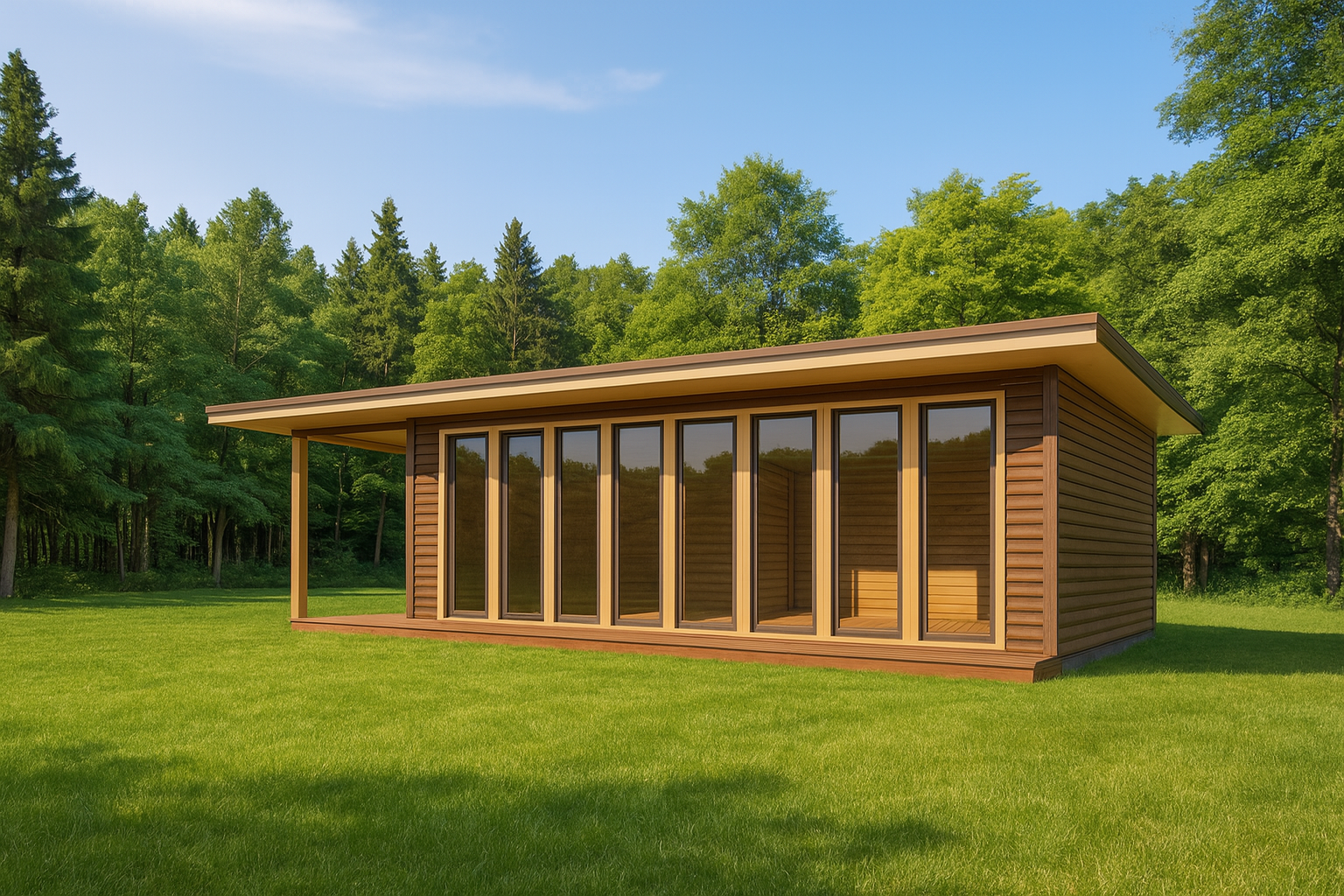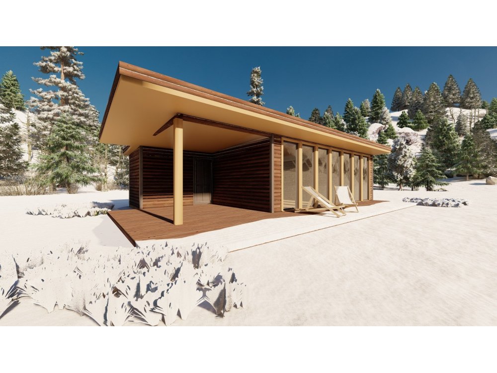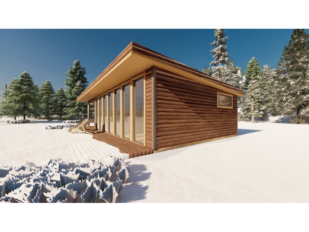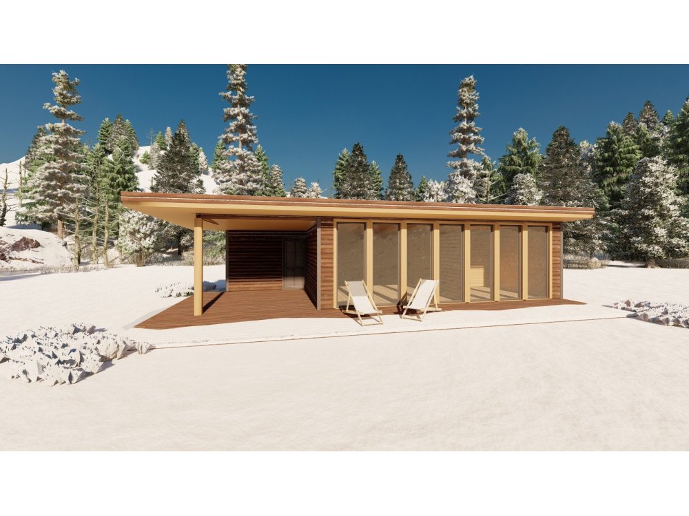 The Aurora Lodge is a modern, single-storey wooden house featuring a sleek mono-pitched roof and expansive glazing, ideal for year-round living or as a spacious seasonal retreat. Measuring 6×11 m, the design combines contemporary style with practical comfort. Full-length PVC windows flood the interior with light, while optional upgrades allow you to tailor the space to your lifestyle needs.